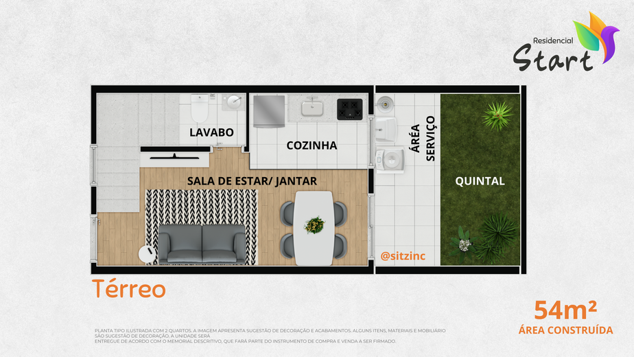 Perspectiva tipo ilustrada do apartamento de 44,05m², com sugestão de decoração. Os móveis e utensílios são de dimensões comerciais e não fazem parte do contrato de compra e venda da unidade. O apartamento será entregue conforme memorial descritivo.